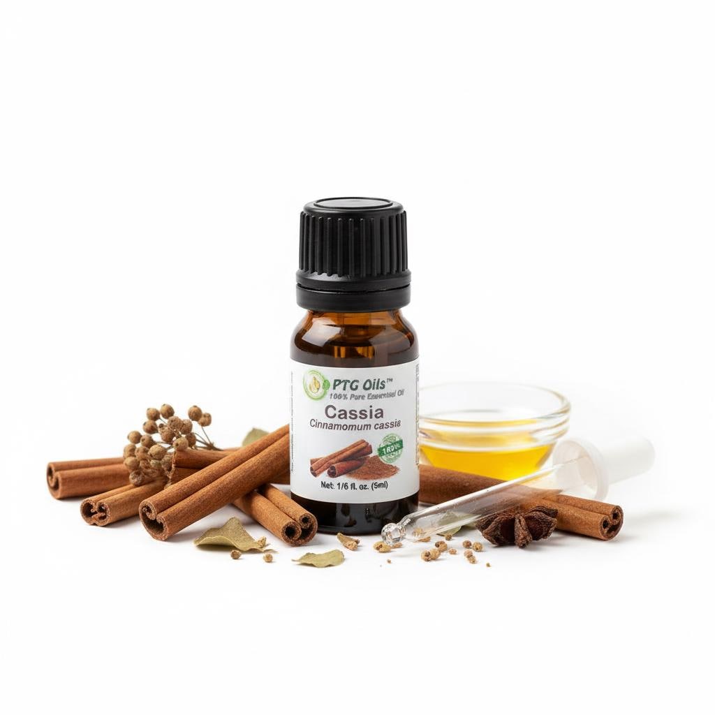 PTG Oils Cassia Essential Oil has a rich warm spicy aroma with bold cinnamon like sweetness and deep comforting undertones that instantly create a cozy inviting atmosphere. Steam distilled from the bark of Cinnamomum cassia grown in China this oil is prized for its strong aromatic presence and classic spice character in aromatherapy and creative use.