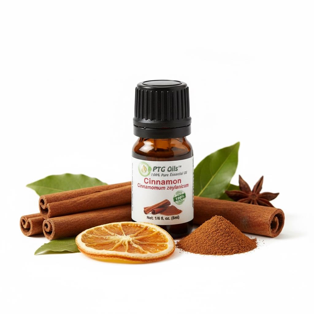 PTG Oils Cinnamon Bark Essential Oil has a rich warm sweet spicy aroma with smooth cinnamon depth and comforting undertones that instantly create a cozy inviting atmosphere. Steam distilled from the bark of Cinnamomum zeylanicum grown in Indonesia this oil is valued for its refined spice character and classic aromatic profile in everyday aromatherapy and creative use.