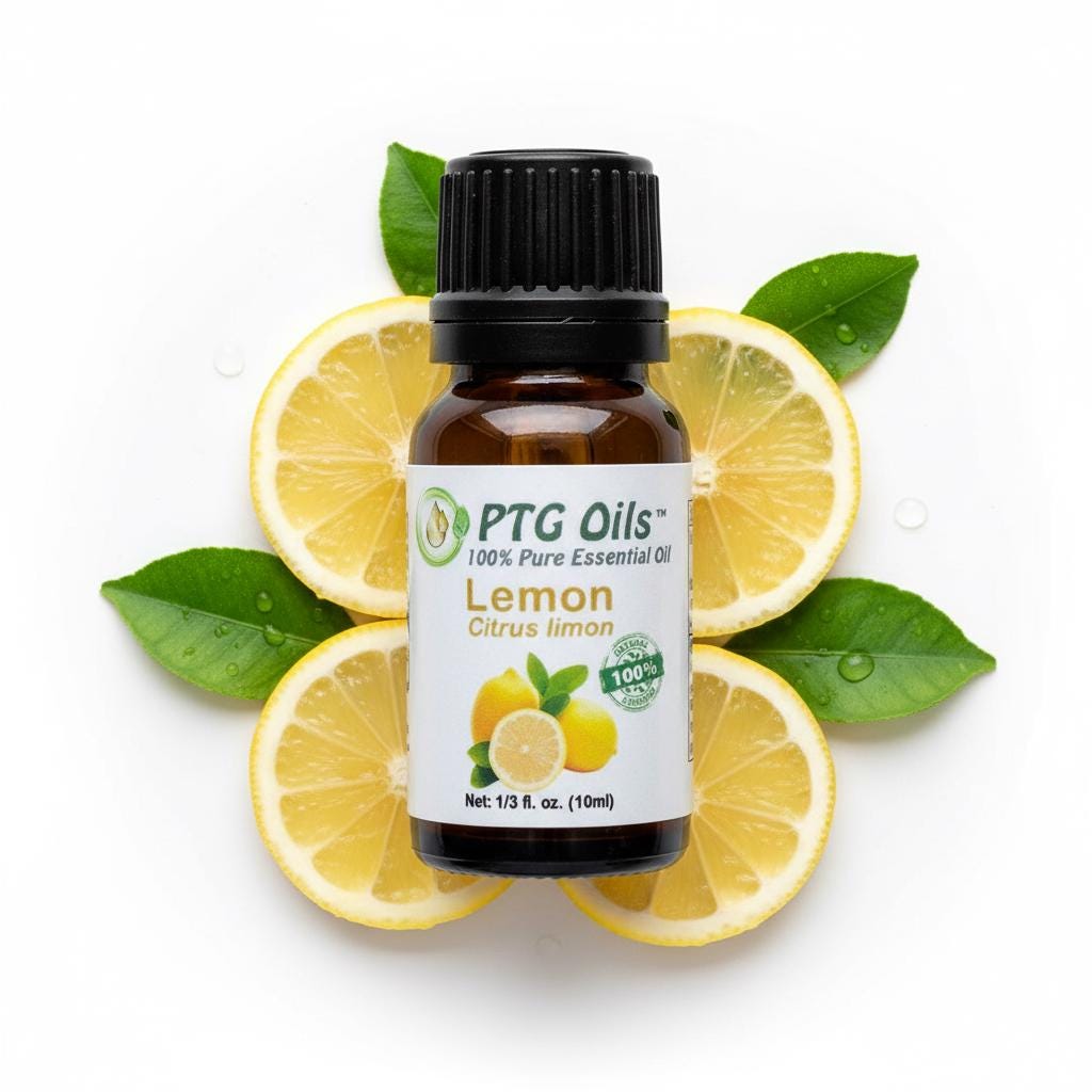 PTG Oils Lemon Essential Oil has a bright fresh citrus aroma with clean zesty and lightly sweet undertones that instantly lift and refresh any space. Cold pressed from the peel of Citrus limonum grown in Italy this oil is valued for its crisp citrus character and versatility in everyday aromatherapy and home fragrance use.