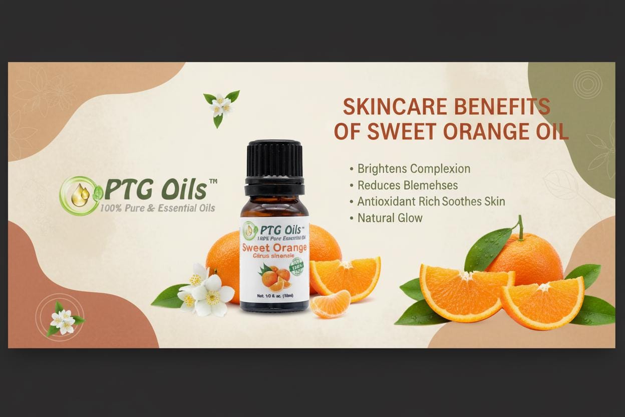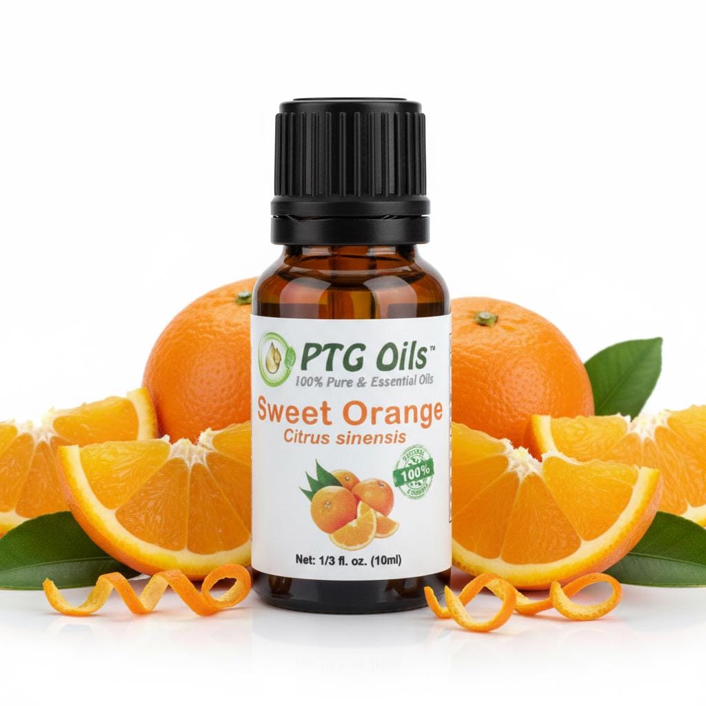 PTG Oils Sweet Orange Essential Oil has a bright sweet citrus aroma with juicy fresh and lightly warm undertones that create a cheerful and uplifting atmosphere. Cold pressed from the peel of Citrus sinensis grown in Portugal this oil is loved for its smooth sweet orange character and wide appeal in everyday aromatherapy and home fragrance use.